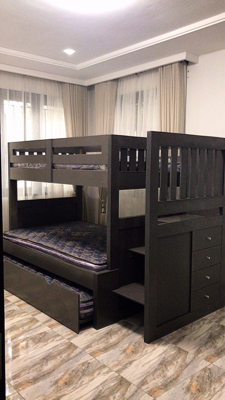 Gifted Home Furniture offers the best collection of bunk beds for sale in Lagos, we also offer great collection for your home and office furniture in Nigeria. We will help you maximize your bedroom space with this custom-made wooden triple bunk bed featuring a pull-out trundle, built-in drawers, and a compact desk area. Crafted with durable hardwood and designed for functionality and style, it’s perfect for kids, teens, or guest rooms.