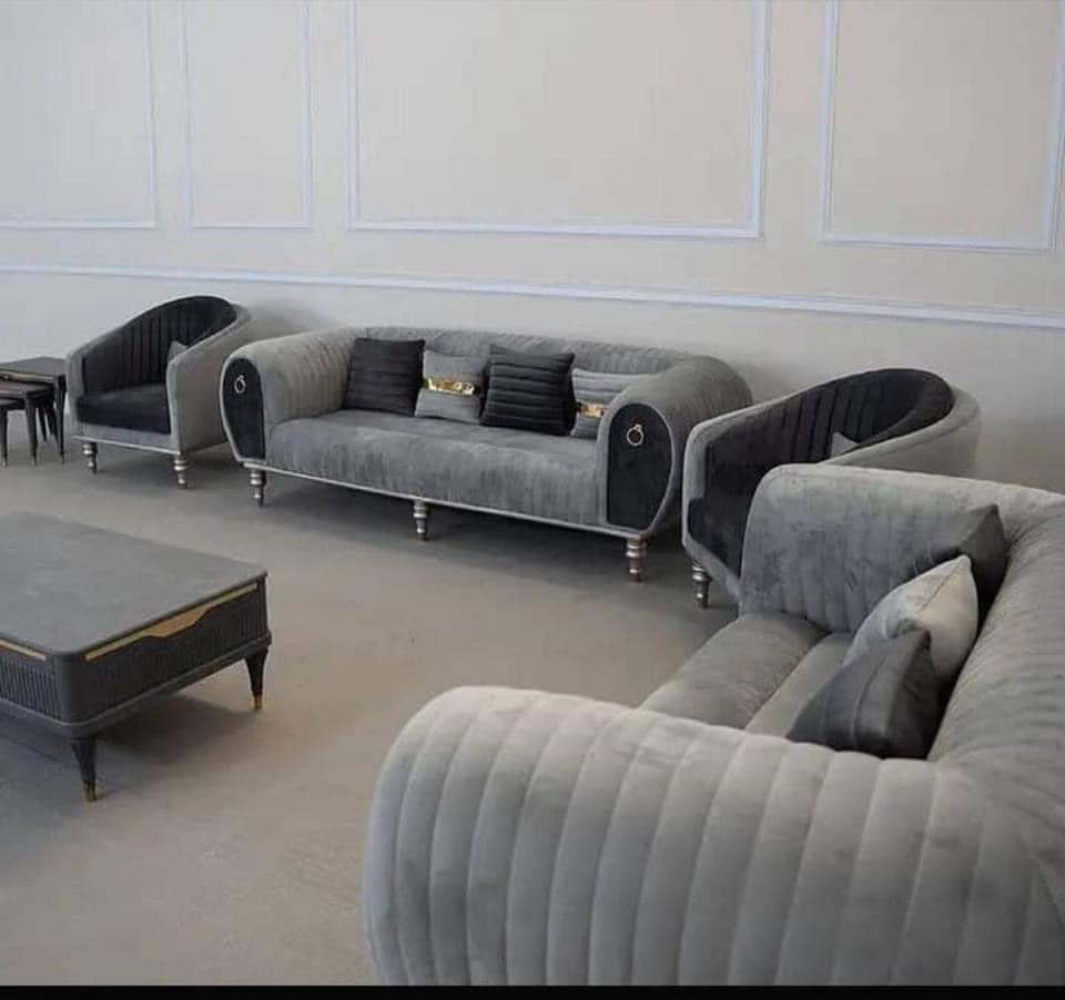 Add elegance and bold character to your living space with this luxury curved velvet sofa set, featuring a blend of soft grey upholstery, black interior accents, and metallic ring handle details. This sophisticated set includes a three-seater, a two-seater and single armchairs—perfectly tailored for comfort and modern glamour.