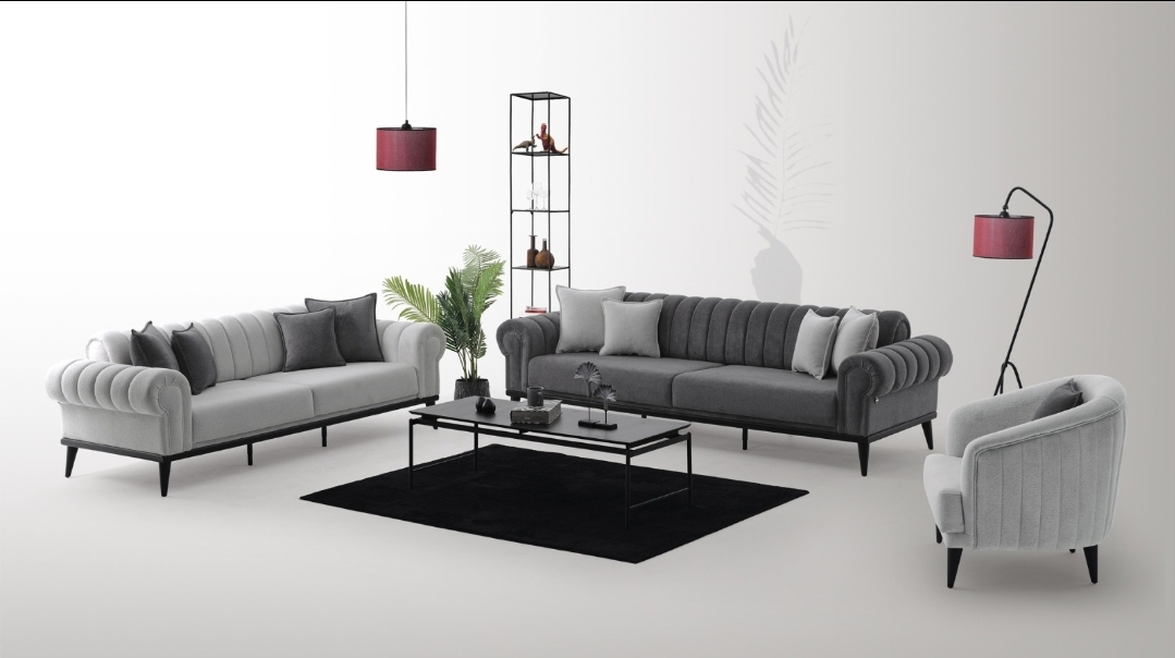Transform your living room with this modern Chesterfield 7-seater sofa set, featuring elegant channel tufting, curved arms, and sleek black metal legs for a contemporary finish. This luxury set includes two spacious 3-seater sofas and a matching accent chair, creating the perfect balance of comfort and sophistication for modern homes and upscale interiors.