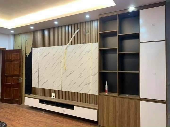 Create a stunning focal point in your living room with this modern TV wall unit, combining sleek marble-style paneling, warm wood tones, and ample built-in storage. Designed with both elegance and functionality in mind, this entertainment wall features open shelves, closed cabinets and a minimalist base unit perfect for organizing consoles, décor, or media accessories.