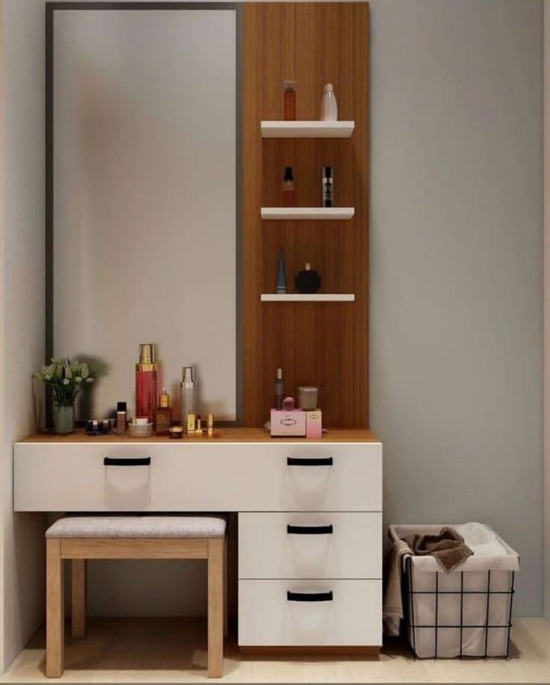 This beautiful vanity table is more than just a piece of furniture – it’s a space made just for you. With lots of drawers, open shelves, and a comfy stool, it keeps all your beauty items organized and within reach.